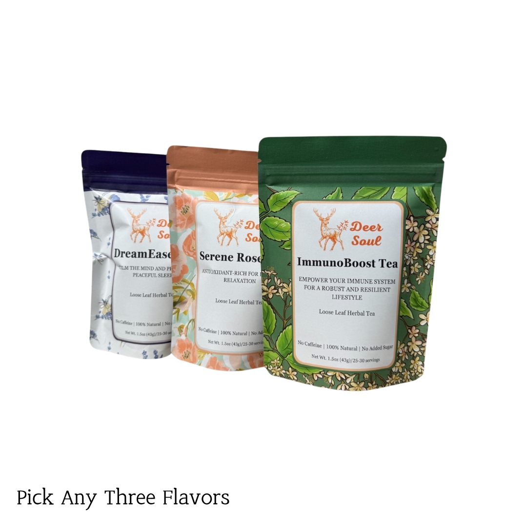 Discover the perfect way to enjoy Deer Soul herbal teas your way! With our 3-Pouch Bundle, you can mix and match any three flavors you love—whether it’s calming Serene Rose, refreshing Vita Hibiscus, or soothing Daily Womb Berry. Each pouch is made with all-natural, organic ingredients, free from sugar and caffeine, crafted to support your slow-living and wellness lifestyle.